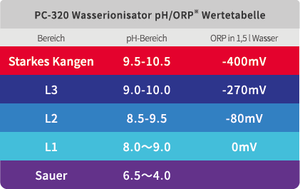 - ※ ORP ist das Redoxpotential. Je negativer ein Redoxpotential ist, desto stärker ist die Reduktionskraft (restaurative Fähigkeit). Je positiver ein Redoxpotential ist, desto stärker ist die Oxidationskraft (Fähigkeit zu Rosten).
