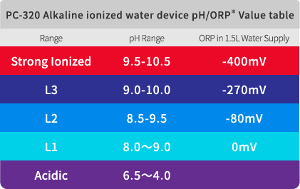 - ※ ORP is Oxidation Reduction Potential. The larger the negative number, the stronger the reduction (restorative ability). The larger the positive number, the stronger the oxidative power (rusting ability).