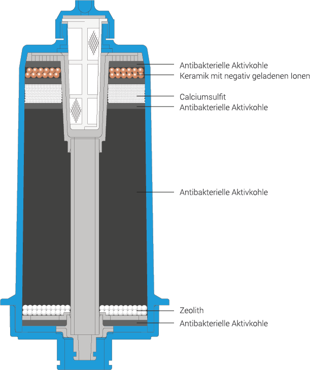 Antibacterial activated carbon Removes residual chlorine and trihalomethanes. Inhibits bacterial growth within the filter to maintain purity |