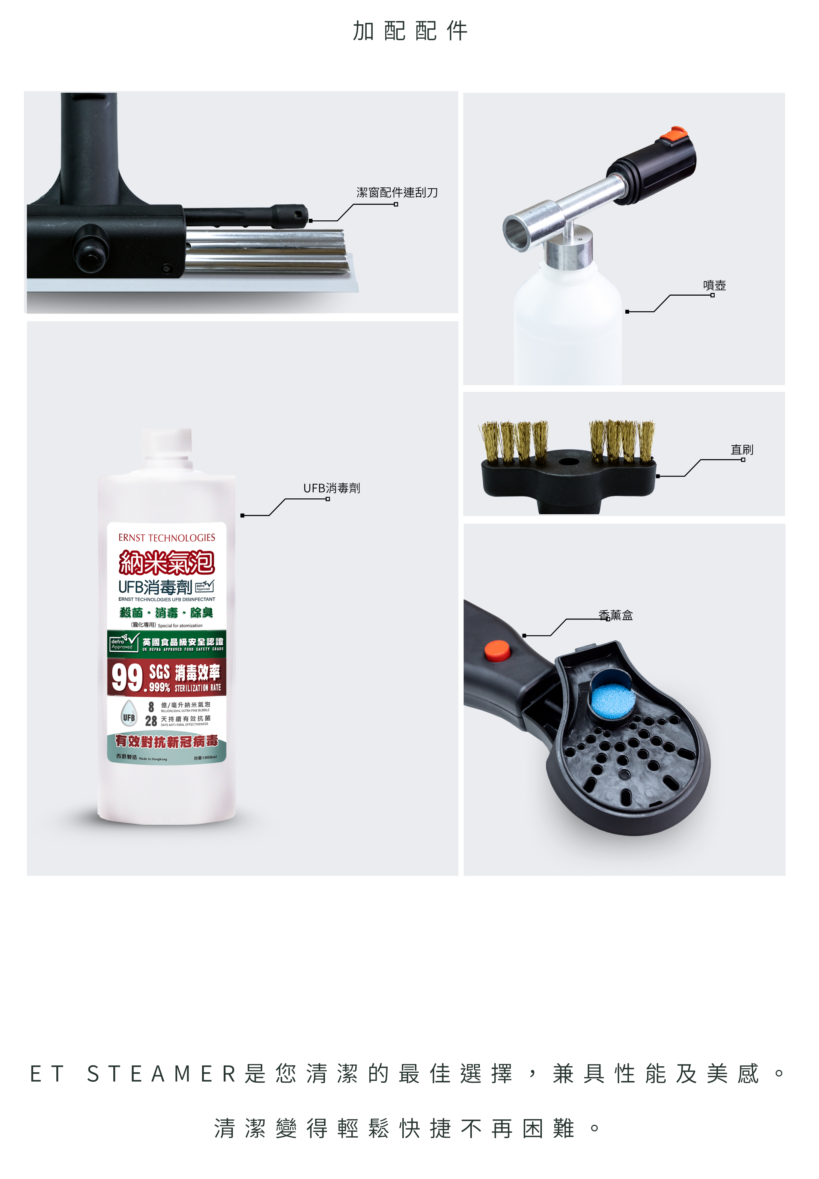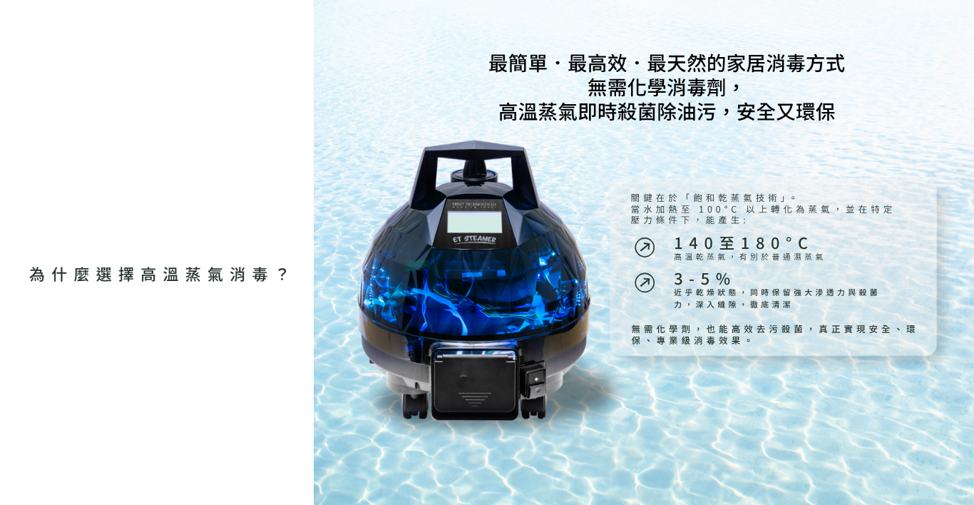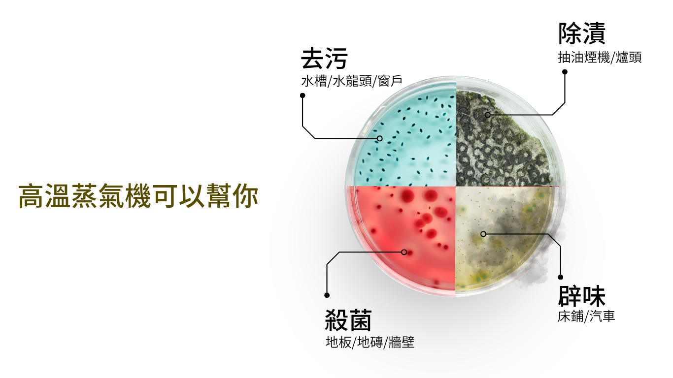 高温蒸氣(攝氏140-180*C)經實驗驗證實可殺減99.9% 常見家居病菌,包括: