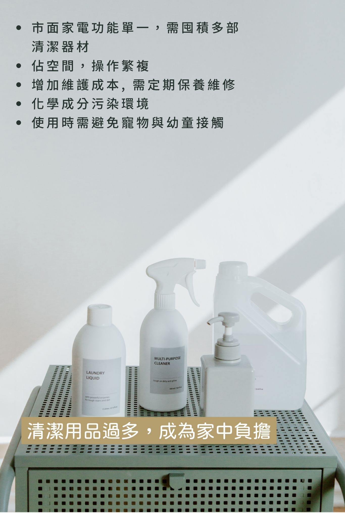繁瑣清潔佔用時間,影響照顧家人:多種清潔劑易致手部過敏,殘留更可能污染食物與兒童用品