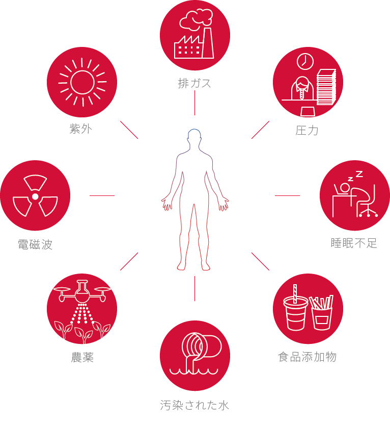 私たちの生活環境にはあらゆるリスクが潜んでいます。活性酸素は、体の内と外から影響を与えます