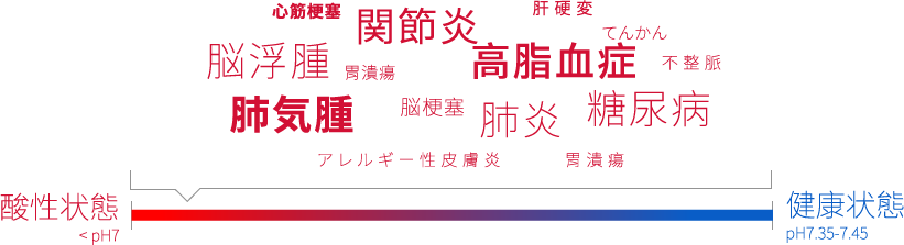 健康的な血液は、7.35から7.45pHで、わずかなアルカリ性を自然と示します。しかし、環境汚染や偏った食生活の影響で、私たちの体は多くの場合、酸性の状態になっています。弱酸性の体は、細胞の機能や新陳代謝を下げるとともに、腎臓や肝臓に余分な負担を与え、老廃物の排出を妨げます。酸性の体質をもつ人々は多くの場合、股関節痛や腰痛を抱え、四肢が弱く、めまい、不眠、下痢、便秘の症状があり、また特に頑固な病気に影響を受けやすいでしょう。電解還元水は人間の免疫システムを強化し、体のpH値を最適な状態である約7.35pHに回復、体のpH値のバランスを保ちます。