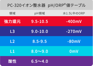 - ※ ORP は、酸化還元電位を意味します。負の値が大きいほど、還元(還元力)が強いことを示します。正の値が大きいほど、酸化(発錆力)が強いことを示します。