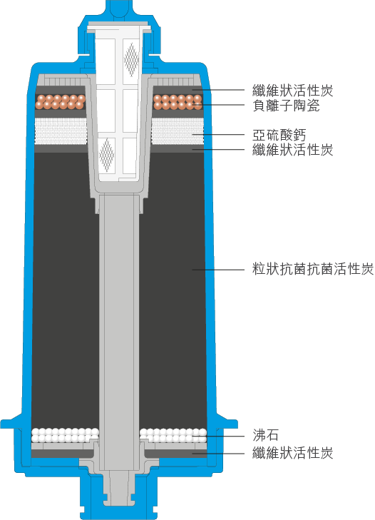 抗菌活性炭 去除殘留氯與三鹵甲烷。抑制過濾器內細菌增生,保持清淨的狀態 |